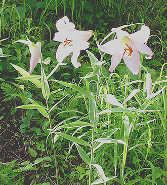 ササユリ 桜香の湯から車で国道158号を高山市清見町方面に向って1-2分という近さに、ササユリの群生地がある。場所は高山市荘川町惣則地区。初夏には辺り一面に咲くササユリの甘い香りが漂う。